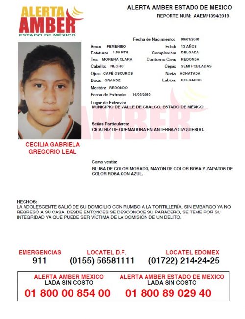Estado de MéxicoSeguridadÚLTIMA HORAActivan Alerta Amber por desaparición de una menor en Valle de Chalco 20 junio, 201920 junio, 201901109 Compartir0 SE activa protocolo ALBA para localiza a la menor, Cecilia Gabriela Gregorio Leal, que desapareció esta tarde en el municipio de Valle de Chalco.