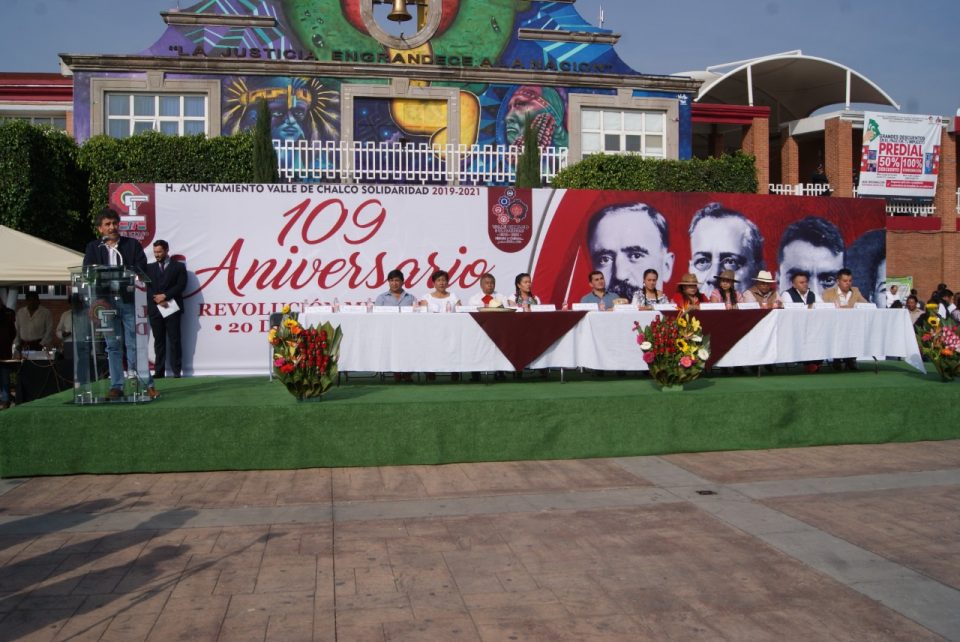 Valle de Chalco, Méx. 20 Noviembre de 2019. La violencia no ayuda en nada, eso debemos decirle a nuestros jóvenes, fue parte del discurso que dio Eliseo Gómez López, secretario del ayuntamiento de Valle de Chalco durante la ceremonia cívica del 109 aniversario de la Revolución Mexicana.