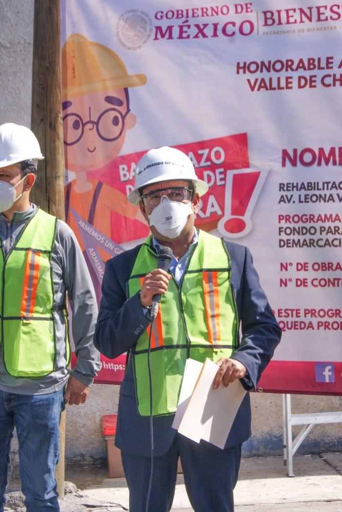 Valle de Chalco, Méx. 31 de julio del 2020. Garantizar una mejor calidad de vida para los habitantes es lo que señaló el presidente municipal de Valle de Chalco, Armando García Méndez al dar el banderazo de inicio de obras en La calle Leona Vicario.