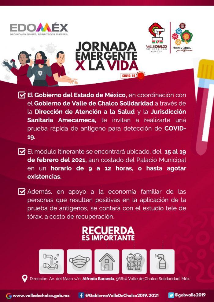 • Con el interés de reforzar las medidas de prevención, contención y erradicación de contagios de covid-19 en Valle de Chalco, el alcalde prepara una nueva edición de la Jornada emergente X la vida.