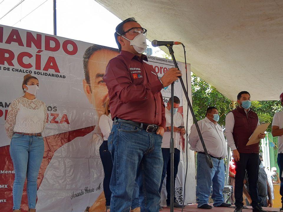 Valle de Chalco, Méx. 12 mayo de 2021. «Porque tenemos que apoyar a este sector olvidado, para darles préstamos a la palabra para que puedan tener un negocio, vamos a crear el programa empoderar a la mujer, porque debemos apoyarlas», dijo el candidato a la presidencia municipal de Valle de Chalco por la coalición Juntos Haremos Historia, Armando García Méndez.
