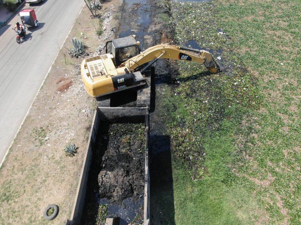 •El gobierno de Valle de Chalco Solidaridad trabaja en coordinación con la Comisión del Agua del Estado de México (CAEM) en las labores de retiro de lirio sobre el cauce del canal Acapol.