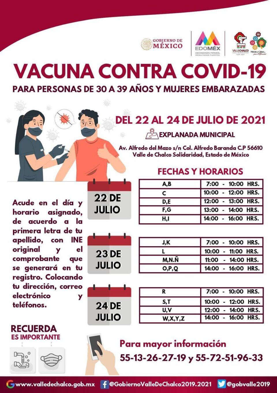 El gobierno de Valle de Chalco Solidaridad se alista para recibir en la explanada municipal, a las personas de 30 a 39 años y mujeres embarazadas mayores de edad con más de 9 semanas de gestación, con motivo de la campaña de vacunación contra el covid-19 que organiza la Secretaría de Bienestar apoyada por la Jurisdicción Sanitaria de Amecameca.