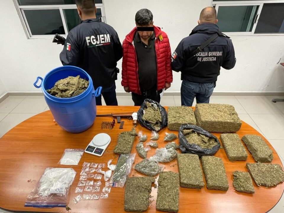 El mandamiento judicial fue otorgado por ello personal de la FGJEM se trasladó al domicilio, en donde fueron asegurados recipientes, bolsas y paquetes con marihuana, con un peso total de 18 kilogramos; 26 bolsas con droga conocida como cristal, con un peso total de 600 gramos; 42 cartuchos útiles calibre 22 mm y 16 mm; un arma de fuego de calibre 22 mm y una báscula gramera.