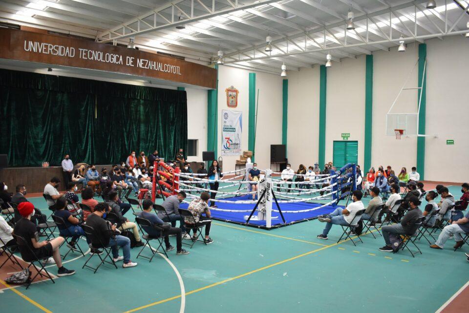 Nezahualcóyotl, Méx.- 11 de octubre 2021.- “Con exhibición de box, a cargo de la entrenadora y pugilista, Victoria Torres Canúl, dan inicio las clases de esta disciplina deportiva en la Universidad Tecnológica de Nezahualcóyotl”, afirmó el Rector de esta casa de estudios, Gerardo Dorantes Mora, durante su presentación como profesora de este deporte en la universidad.