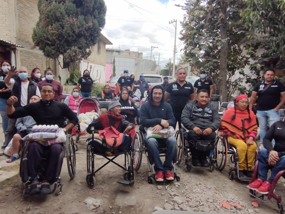 Chalco, Méx. 19 noviembre del 2021. Integrantes del Club Deportivo de Personas con Discapacidad A.C y pobladores de la colonia Alcanfores del municipio de Chalco recibieron apoyos alimentarios por parte de Mireya Ramírez Pérez, presidenta de la asociación civil Visión Ciudadana y cuarta regidora.