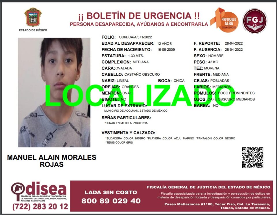 De acuerdo con información del titular del área de Prevención del Delito, Antulio Castañeda Martínez, se trata de Manuel Alain Morales Rojas de 12 años de edad, quien fue localizado por la célula de búsqueda del municipio de Chimalhuacán y se encuentra de nueva cuenta en el albergue.