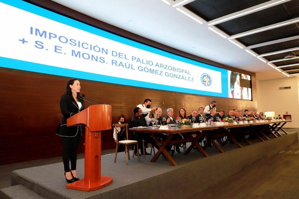 En representación del Gobernador Alfredo Del Mazo Maza, la Secretaria de Desarrollo Social participó en un encuentro realizado por la Imposición del Palio Arzobispal, a Su Excelencia, Monseñor Raúl Gómez González, Arzobispo Metropolitano de Toluca, a quien expresó su respeto y le deseó éxito al frente de esta responsabilidad.