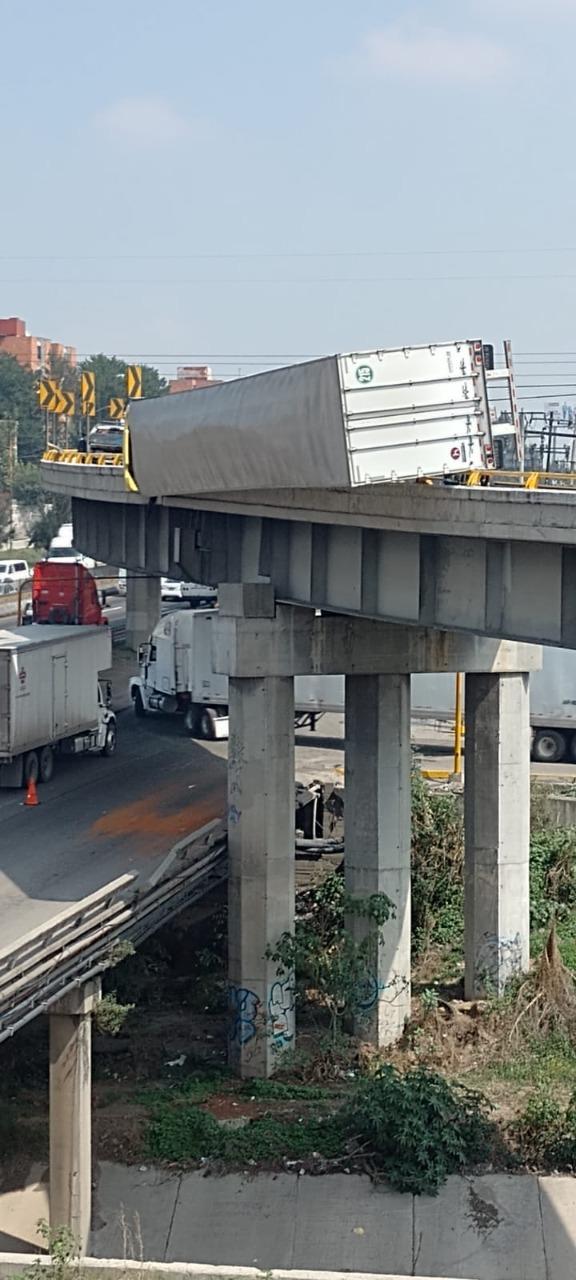 Cuautitlán Izcalli, Estado de México, 22 de agosto de 2022. Alrededor de las 10:45 horas, una unidad de transporte de carga quedó recargada sobre el parapeto de la gasa de salida del Circuito Exterior Mexiquense que va hacia el estado de Querétaro, sin que se presentaran lesionados.