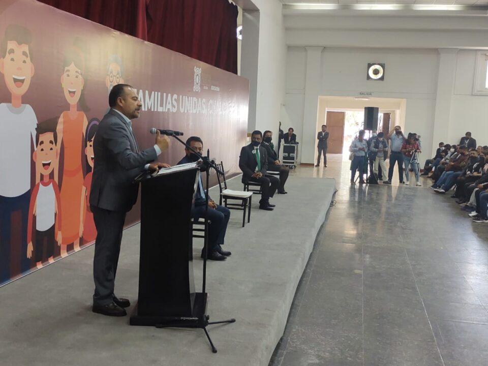 El director de educación, Jesús Rosas Salgado destacó que este programa que impulsa si dirección va destinado a proteger y cuidar a los estudiantes del nivel medio, » es un proyecto grande que queremos impulsar en las escuelas y gracias a la confianza del gobierno municipal se comenzó, que es la escuela para padres por un Chalco Seguro Familia unidas, por eso tenemos a los papás y a los hijos para escuchar al ponente Miguel Angel Tenorio sobre cómo hablar de los hijos y controlar sus conductas.