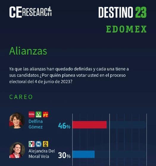 La maestra Delfina Gómez, de MORENA, aumentó de 15 a 16 puntos su ventaja de intención de voto sobre Alejandra del Moral, del PRI, reveló la última encuesta realizada por Campaigns&Elections, publicada este 27 de febrero.