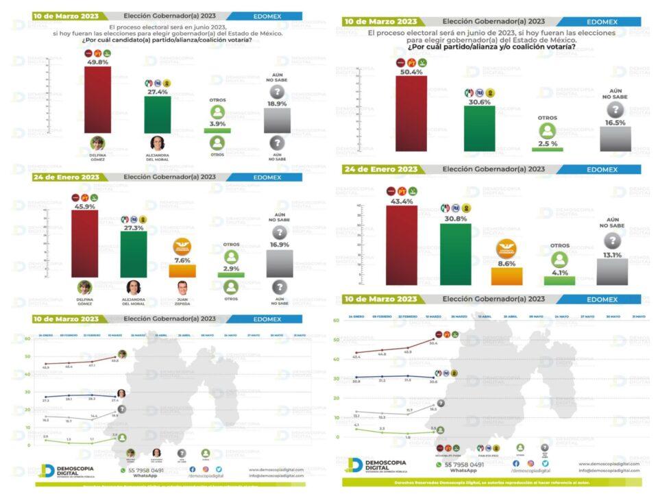 Con los 49.8 por ciento de intención de voto en dicha encuesta del 10 de marzo, la primera sin el nombre de Juan Zepeda en el cuestionario, la maestra Delfina Gómez está a 22.4 puntos por encima de Alejandra del Moral, quien tiene 27.4 por ciento.