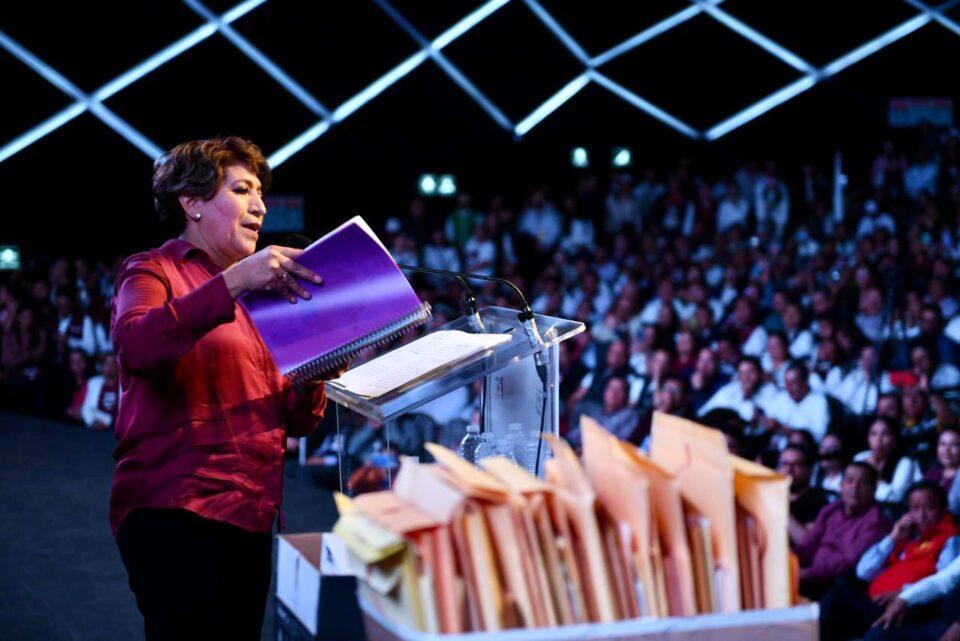 TOLUCA, Estado de México.– La maestra Delfina Gómez presentó su plan de Gobierno del Bienestar 2023-2029, denominado “Propuestas de Cambio” que incluye Primer Empleo para Jóvenes, Mujeres de Bienestar, Seguridad y Cero Corrupción, transporte público y agua para todos, entre otros.