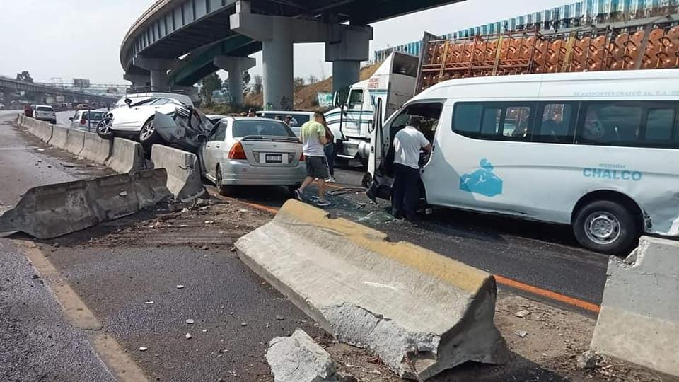 Valle de Chalco, EDOMEX. Una carambola de varios vehículos particulares y una camioneta de transporte público se registró esta tarde sobre la autopista México Puebla a la altura de la Caseta Vieja, lo que provocó el cierre de circulación en el sentido hacia la Ciudad de México para realizar las maniobras de retiro de las unidades, a pesar de lo aparatoso no se reportan personas fallecidas y solo hubo tres lesionados que fueron atendidos en el lugar.