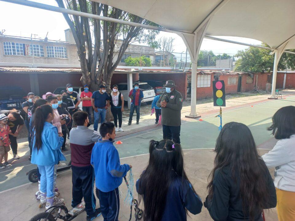 Valle de Chalco, Méx. 5 mayo del 2023. Taller de educación vial y Protocolo Alba realizan elementos de la Cédula de Búsqueda de Personas Desaparecidas o Ausentes de la Dirección de Seguridad Pública y Tránsito municipal de Valle de Chalco en diferentes instituciones escolares.