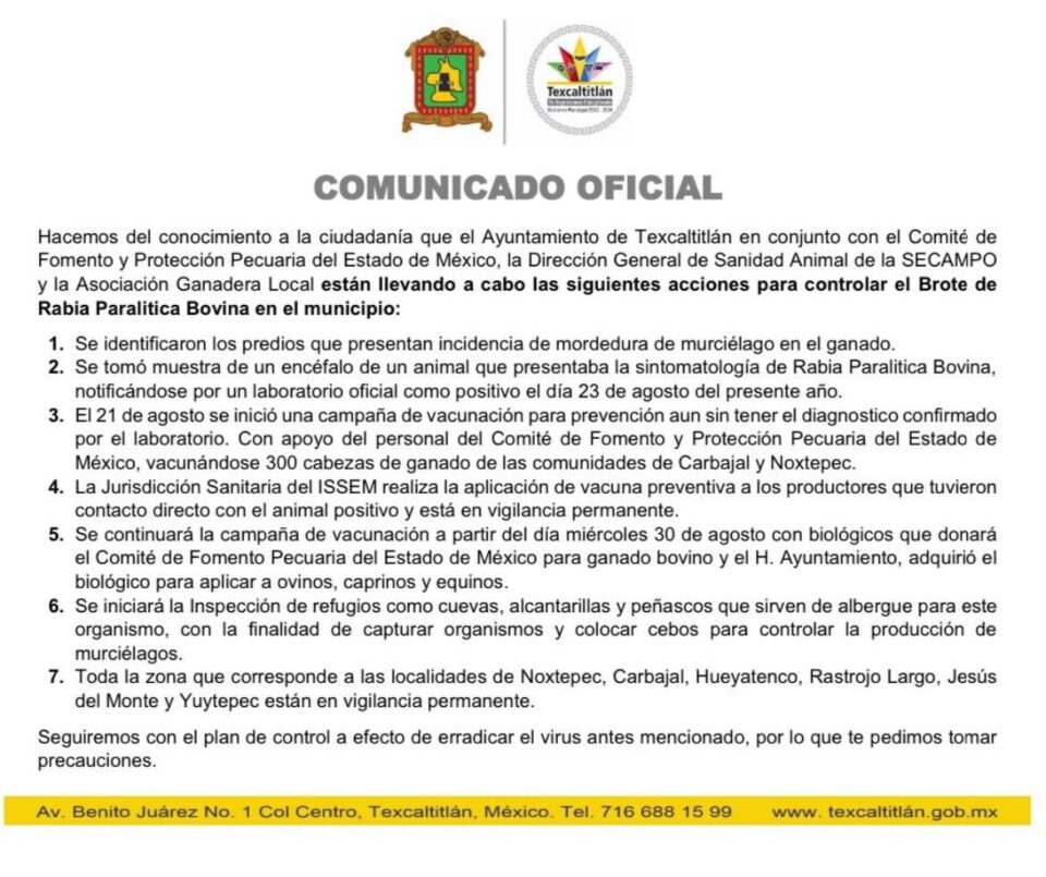 Más tarde y por medio de un comunicado el gobierno local informó que ya tomaron acciones en coordinación con el Comité de Fomento y Protección Pecuaria del Estado de México, la Dirección General de Sanidad Animal de la Secretaría del Campo del Estado de México (Secampo) y la Asociación de Ganadera de Texcaltitlán.