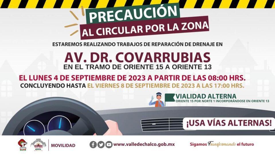 Valle de Chalco. 3 de septiembre de 2023. El.gobietno de Valle de Chalco iniciará con la reparación del sistema de drenaje en la avenida Covarrubias por lo que del 4 al 8 de septiembre se realizarán corte de circulación en esta vía de comunicación.