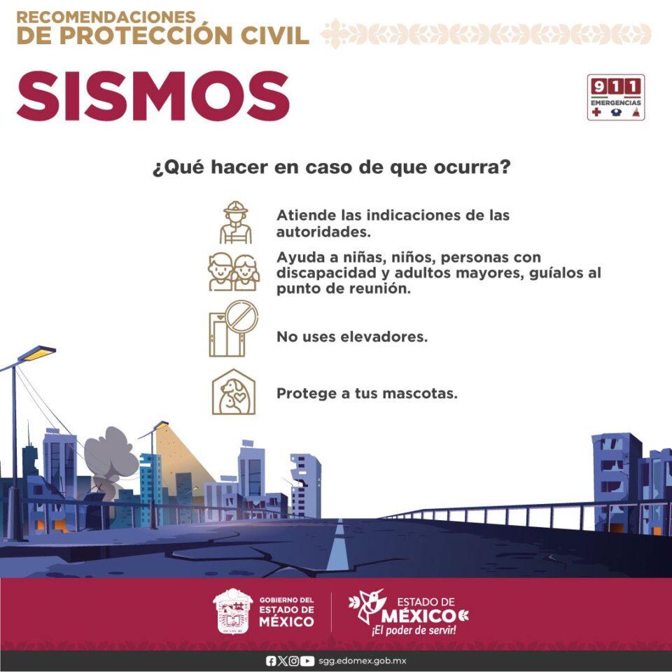 Además, se activaron los protocolos de evacuación en inmuebles, así como recorridos en los 125 municipios por parte de las Unidades Municipales de Protección Civil, sin reporte de afectaciones o daños en la entidad.