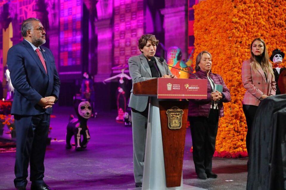TOLUCA, Estado de México.- Conjuntando el misticismo y la magia que representa la conmemoración del Día de los Muertos, la Gobernadora Delfina Gómez Álvarez inauguró la Ofrenda Monumental alusiva a esta festividad en el Patio Central de Palacio de Gobierno.
