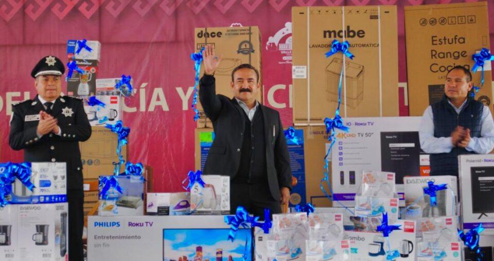 Además del equipo útil para desarrollar su labor diaria, las y los policías fueron festejados con la rifa de lavadoras, refrigeradores, pantallas de televisión, estufas, baterías de cocina, ventiladores, hornos de microondas, bocinas y muchos electrodomésticos más como cafeteras y planchas.