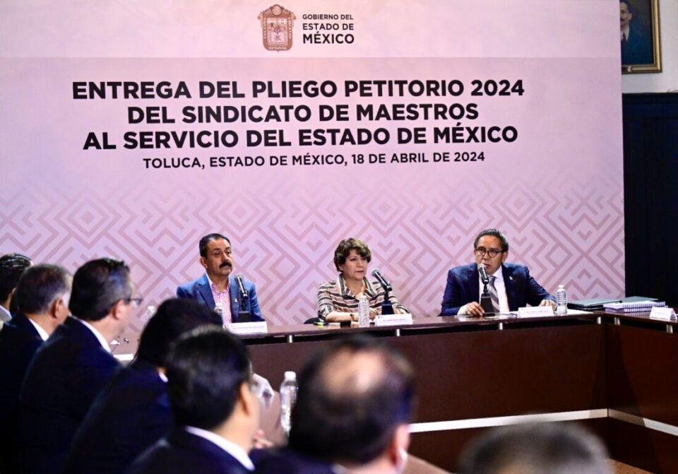 TOLUCA, Estado de México.- La Gobernadora del Estado de México, Delfina Gómez Álvarez recibió a la dirigencia del Sindicato de Maestros al Servicio del Estado de México (SMSEM), quienes entregaron los Pliegos Petitorios de los Asuntos Económicos y Profesionales 2024 de esta organización sindical.