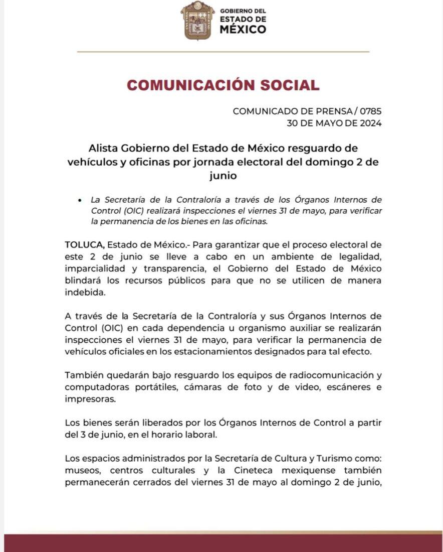 Los espacios administrados por la Secretaría de Cultura y Turismo como: museos, centros culturales y la Cineteca mexiquense también permanecerán cerrados del viernes 31 de mayo al domingo 2 de junio, reanudando actividades administrativas el lunes 3 de junio, en los horarios habituales.