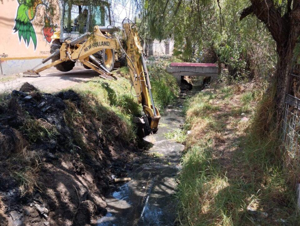 En los canales de San José y De Riego, en el pueblo de Axotlán y San José Huilango, respectivamente, personal de Grupo Tláloc de la Comisión del Agua del Estado de México (CAEM) realizó trabajos de corte de pasto y arbustos, retiro de basura, rectificación de talud y desazolve del cauce en un rango de 2 kilómetros, donde se quitaron 228 metros cúbicos de azolve con el apoyo de una retroexcavadora y herramientas de mano a fin de que no se generé un tapón de desechos sólidos y lograr una mejor captación pluvial.