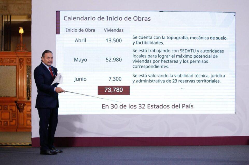Estableció que, actualmente, ya se cuenta con una reserva territorial de 424 hectáreas, distribuidas en 29 estados del país, donde se tiene proyectado construir más de 73 mil viviendas en este año. Detalló que en abril se tiene previsto iniciar las obras de 13 mil 500 casas; en mayo, casi 53 mil; y en junio, más de 7 mil.