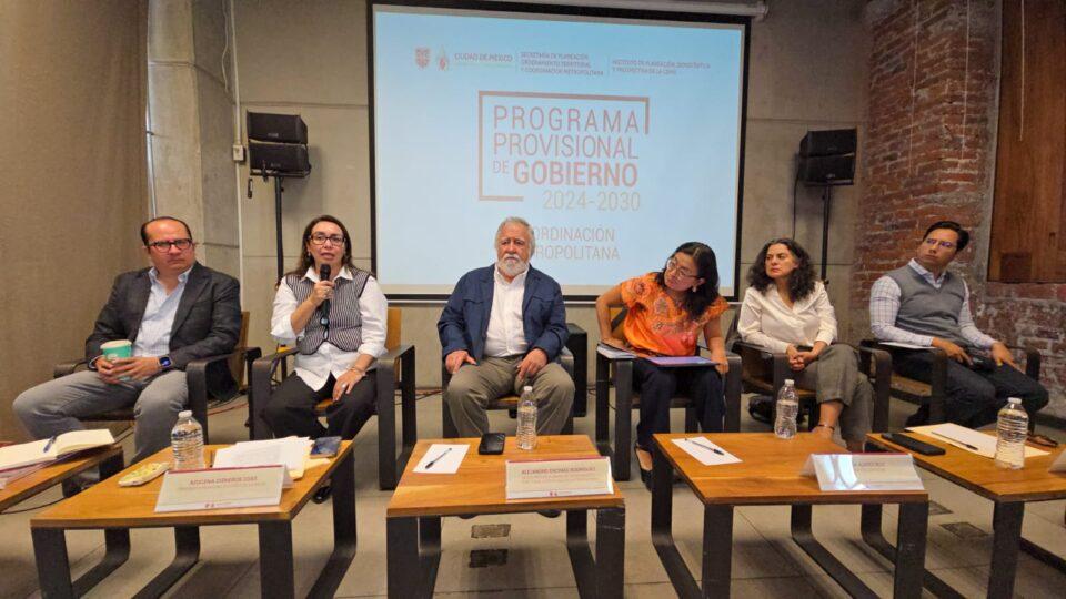 La consulta para elaborar el Programa Provisional de Gobierno 2024-2025, con el tema Coordinación Metropolitana, fue encabezada por Alejandro Encinas Rodríguez, secretario de Planeación, Ordenamiento Territorial y Coordinación Metropolitana, y además de Cisneros Coss participaron Aleida Alavez Ruiz, alcaldesa de Iztapalapa; Martha Patiño, del grupo Ciudad Sin Muros; Carlos Flores Vargas, director de Corazón Capital, y Federico Taboada López, director ejecutivo de Planeación del Desarrollo.