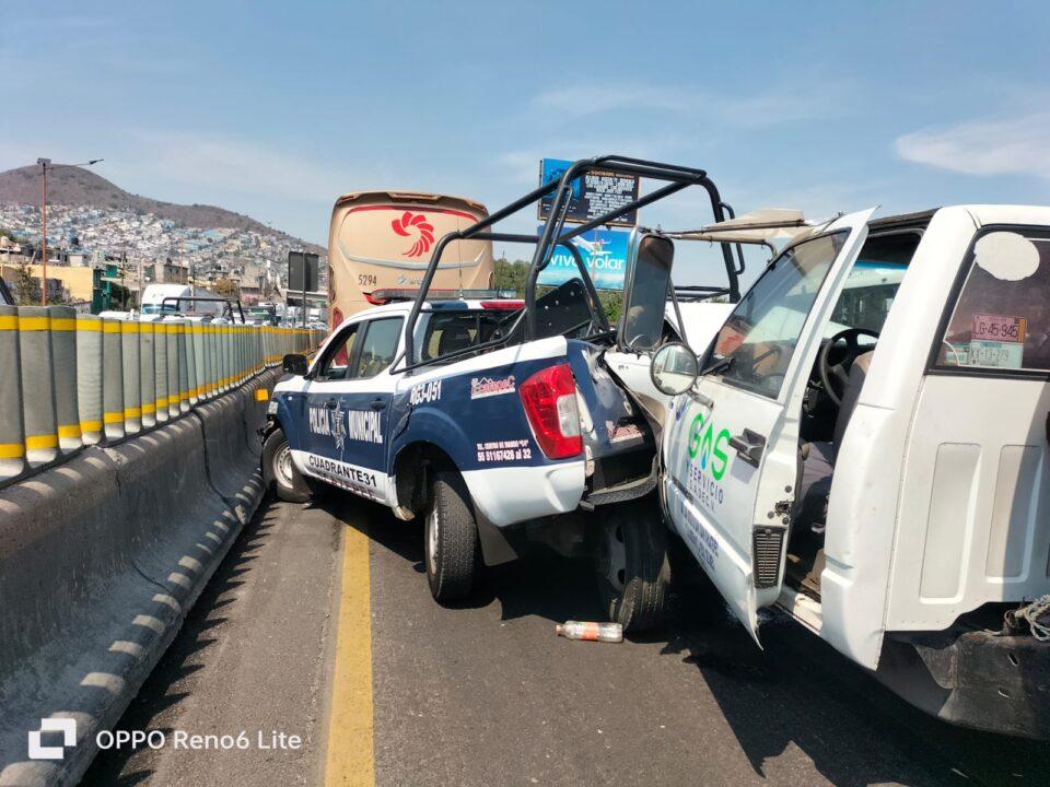 ,Ecatepec, Méx., a 05 de marzo de 2025. Una patrulla de la Dirección de Seguridad Ciudadana y Tránsito Municipal fue impactada en la parte trasera por una pipa de la empresa Gas y Servicio S. A. de C. V., cuando circulaba en la autopista México-Pachuca, lo que ocasionó lesiones a dos policías municipales, quienes fueron trasladados al hospital del ISSEMyM para su atención médica.