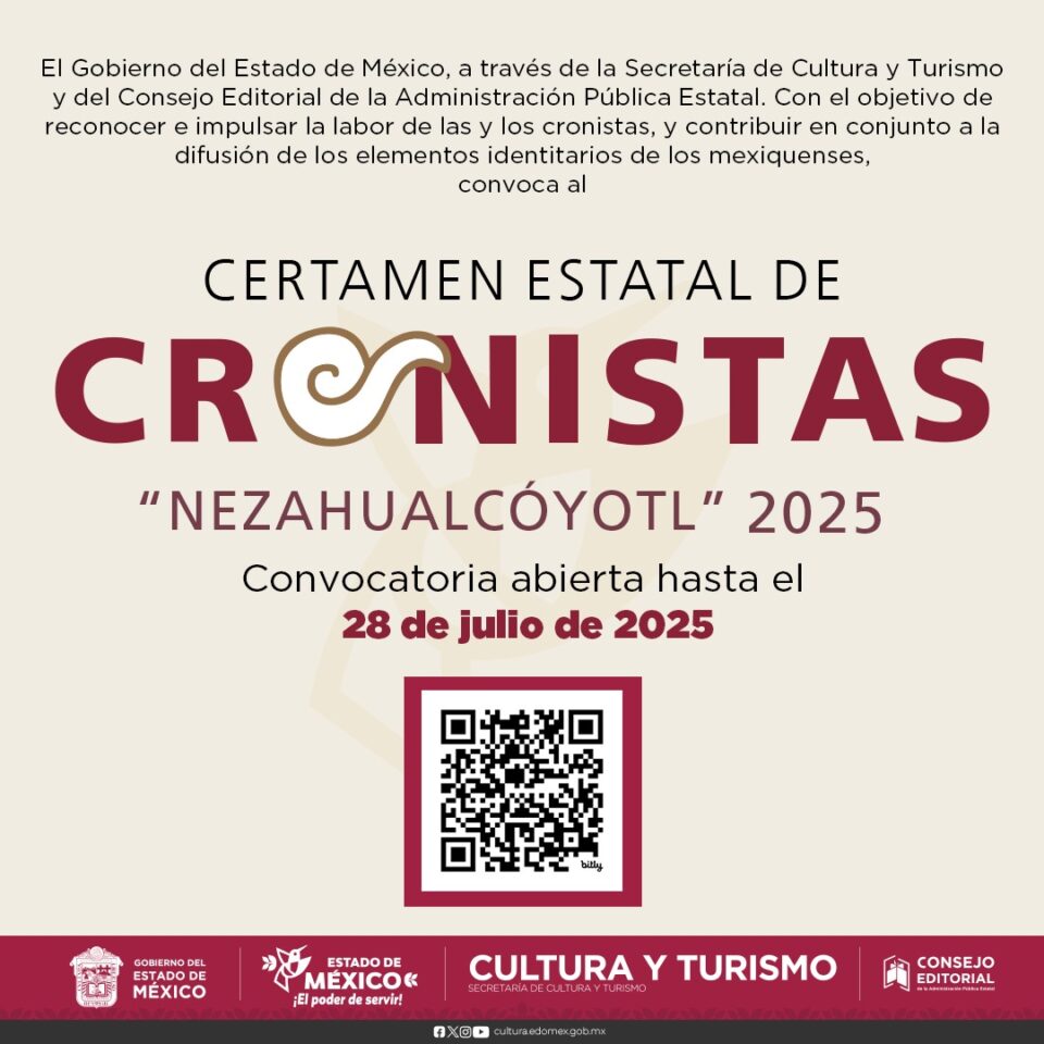 TOLUCA, Estado de México. – El Gobierno del Estado de México lanza la convocatoria al Certamen Estatal de Cronistas “Nezahualcóyotl” 2025, con el propósito de reconocer la labor de quienes preservan y narran la memoria histórica y cultural de las comunidades mexiquenses.