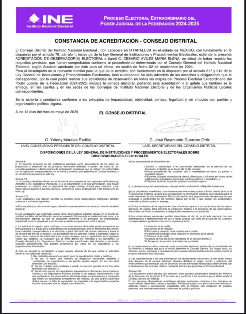 CHALCO, Edomex., 1 de junio de 2025.- En medio de retrasos generalizados para la instalación de casillas, ciudadanos acreditados como observadores electorales denunciaron haber sido excluidos de participar en la jornada electoral de este domingo, pese a contar con gafete oficial y capacitación previa por parte del Instituto Nacional Electoral (INE).