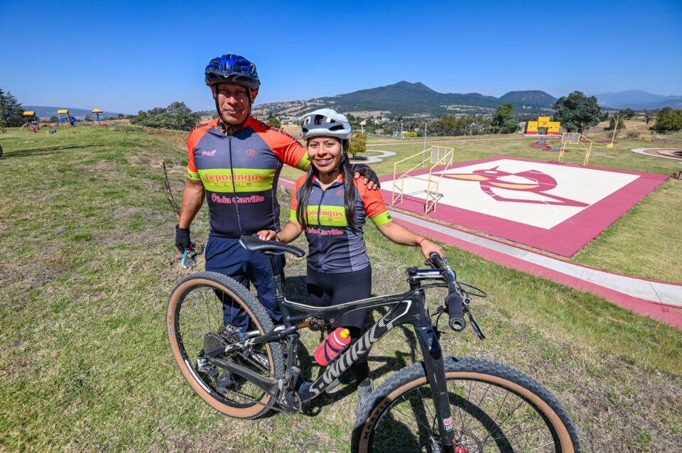 “Practico el ciclismo de montaña, me gusta practicarlo con mis hijas, en familia y muchos compañeros de la zona”, compartió Pierre Padilla Galicia, un joven padre que disfruta la compañía de su hija Ana María, en la Unidad Deportiva Ayapango, donde la vista de los volcanes Popocatépetl e Iztaccíhuatl predomina en el paisaje.