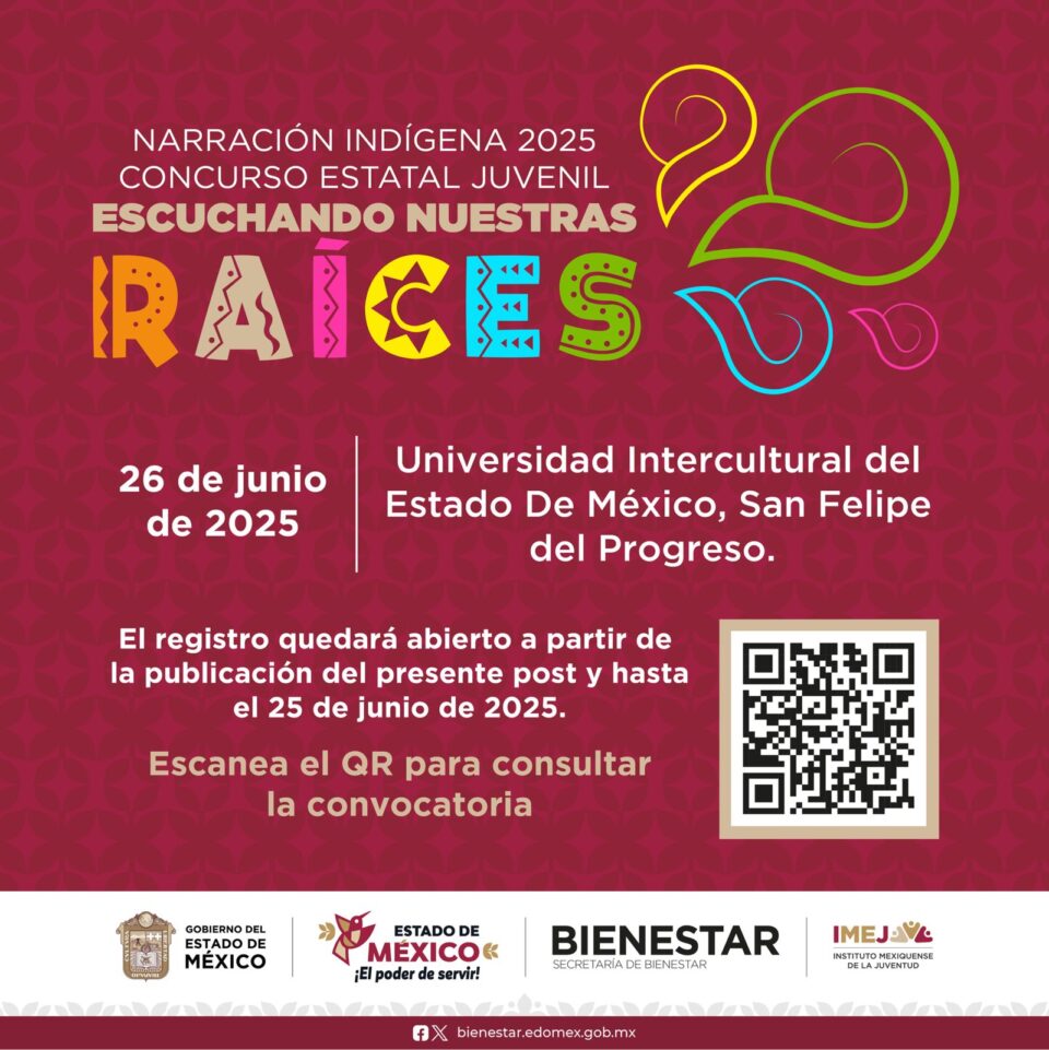 TOLUCA, Estado de México. – El Gobierno del Estado de México, a través de la Secretaría de Bienestar y el Instituto Mexiquense de la Juventud (IMEJ), convoca a jóvenes de entre 12 y 29 años, pertenecientes a pueblos originarios, a participar en el Concurso Estatal Juvenil de Narración Indígena 2025 “Escuchando Nuestras Raíces”.