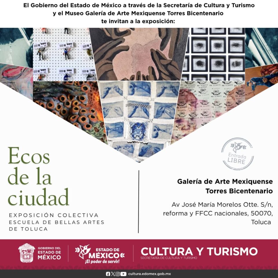 TOLUCA, Estado de México. – La Secretaría de Cultura y Turismo del Estado de México abre una nueva ventana al arte emergente con la exposición “Ecos de la ciudad”, una muestra colectiva de jóvenes egresados de la Escuela de Bellas Artes de Toluca que será inaugurada el próximo viernes 4 de julio a las 16:00 horas en la Galería de Arte Mexiquense Torres Bicentenario.