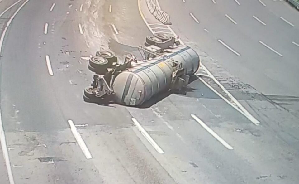 ECATEPEC, Méx., 13 de julio de 2025.- Bomberos del municipio de Ecatepec acudieron en apoyo para atender la volcadura de una pipa que transportaba 64 mil litros de gasolina, accidente que provocó una peligrosa fuga de combustible sobre la autopista México-Pachuca, justo en los límites con Tlalnepantla.