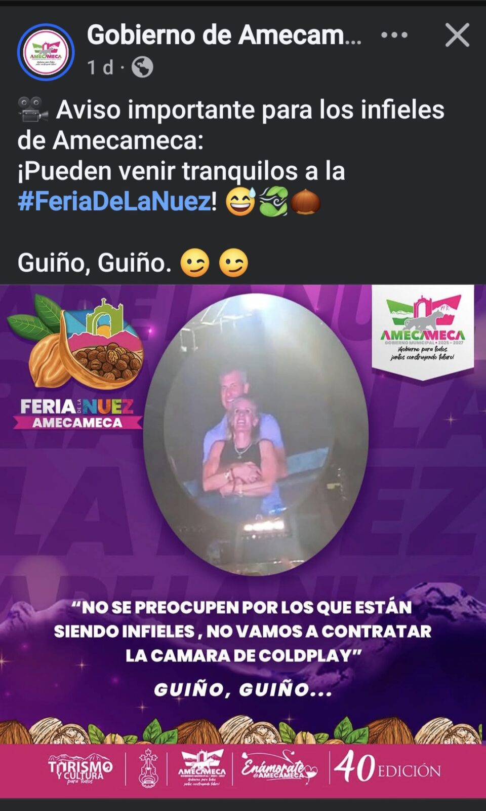 El posteo, difundido en la cuenta oficial del Gobierno de Amecameca, incluye una imagen de una pareja abrazándose proyectada en pantalla gigante, acompañada del mensaje: “Aviso importante para los infieles de Amecameca: ¡Pueden venir tranquilos a la #FeriaDeLaNuez! 😅🥬🌰 Guíño, guiño.”