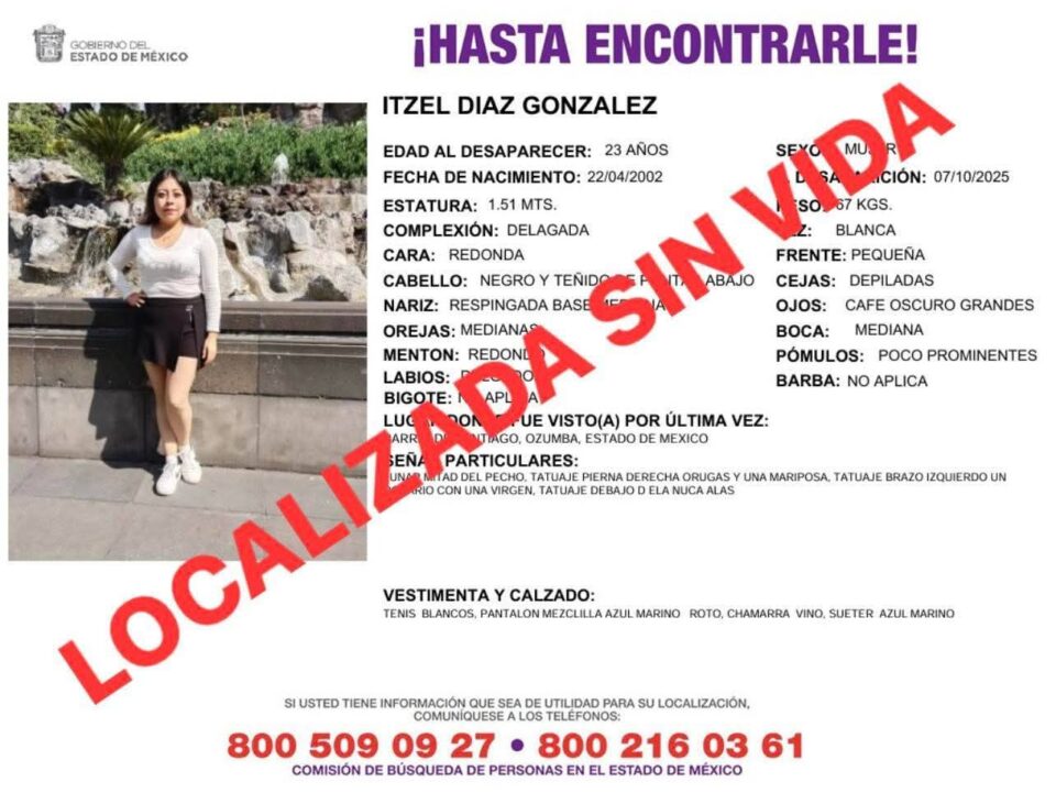 OZUMBA, Méx., 9 de octubre de 2025.- Luego de dos días de intensa búsqueda, autoridades de la Fiscalía General de Justicia del Estado de México (FGJEM) localizaron sin vida a la joven Itzel Díaz González, quien había sido reportada como desaparecida en el municipio de Ozumba. Su cuerpo fue hallado dentro de una cisterna en un inmueble del vecino municipio de Tepetlixpa.