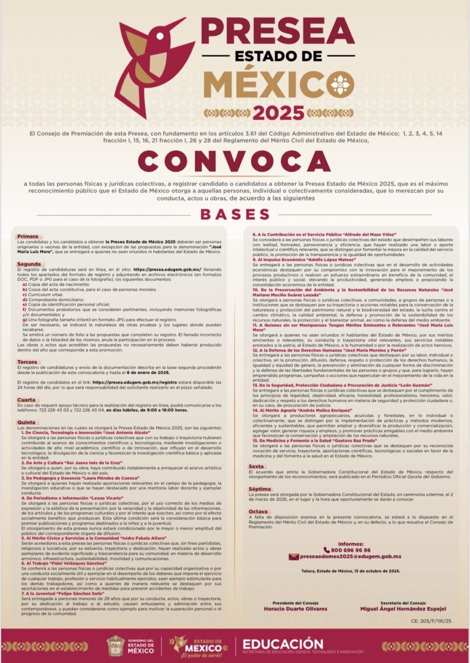 TOLUCA, Estado de México.- El Gobierno mexiquense invita a presentar propuestas para recibir la Presea Estado de México 2025, galardón que, desde hace 42 años, es el máximo reconocimiento público que el Estado de México otorga a aquellas personas, individual o colectivamente consideradas, que lo merezcan por su conducta, actos u obras.