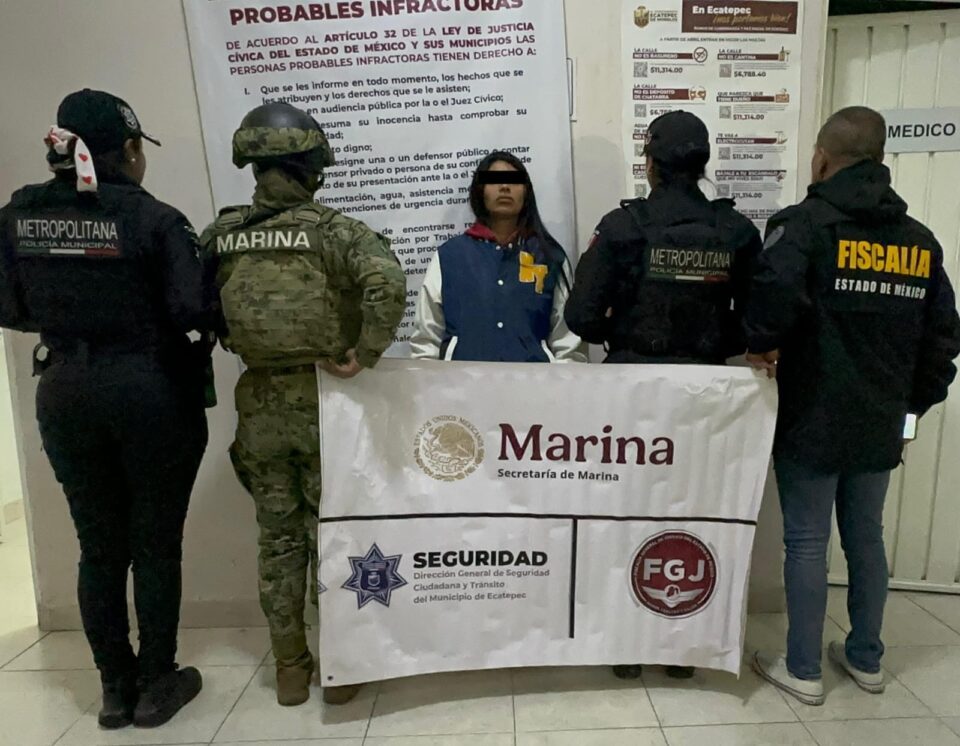 Ecatepec, Méx., a 17 de noviembre de 2025. Elementos de la policía municipal con respaldo de Marina detuvieron a una mujer quien contaba con orden de reaprehensión por robo agravado en la Ciudad de México y a quien entregaron a la Fiscalía Mexiquense.