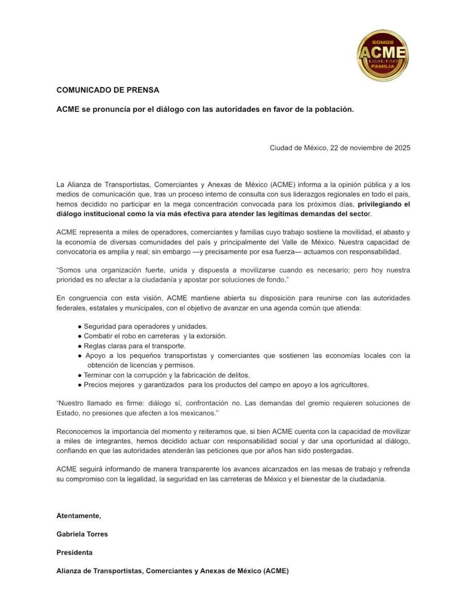 TOLUCA, Méx., 23 de noviembre de 2025.- La Alianza de Transportistas, Comerciantes y Anexas de México (ACME) anunció que no participará en la mega concentración convocada a nivel nacional, luego de realizar una consulta interna con liderazgos de todo el país.