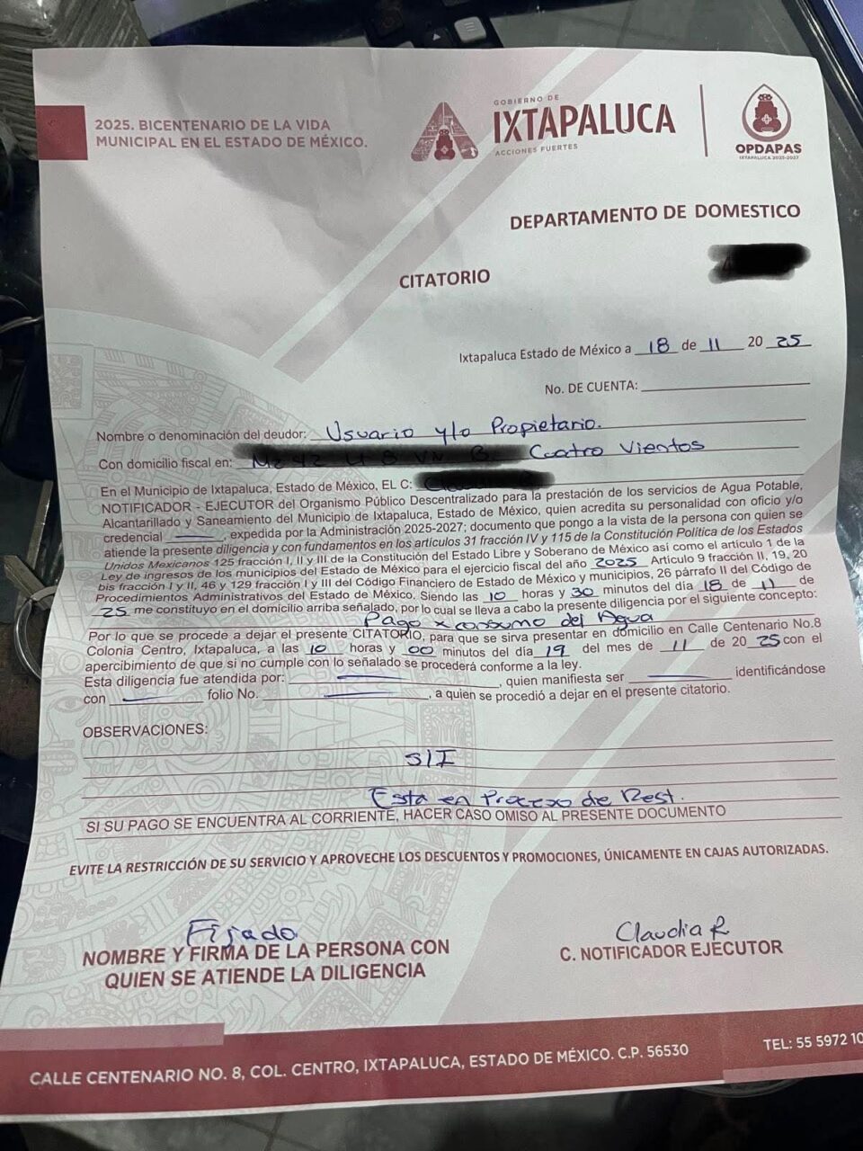 Vecinos mencionaron que los citatorios entregados contienen advertencias de restricción del servicio, pese a que en la zona prácticamente no hay flujo de agua por tubería. Para algunos, la situación es contradictoria: “¿Qué nos van a cortar si no tenemos nada?”, cuestionó otro de los afectados.