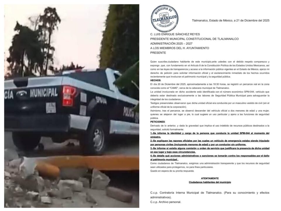 Ante estos hechos, ciudadanos de Tlalmanalco dirigieron un escrito formal al presidente municipal constitucional, Luis Enrique Sánchez Reyes, y a los integrantes del Ayuntamiento, en el que solicitaron información oficial y una investigación inmediata, con fundamento en el artículo 8 de la Constitución.