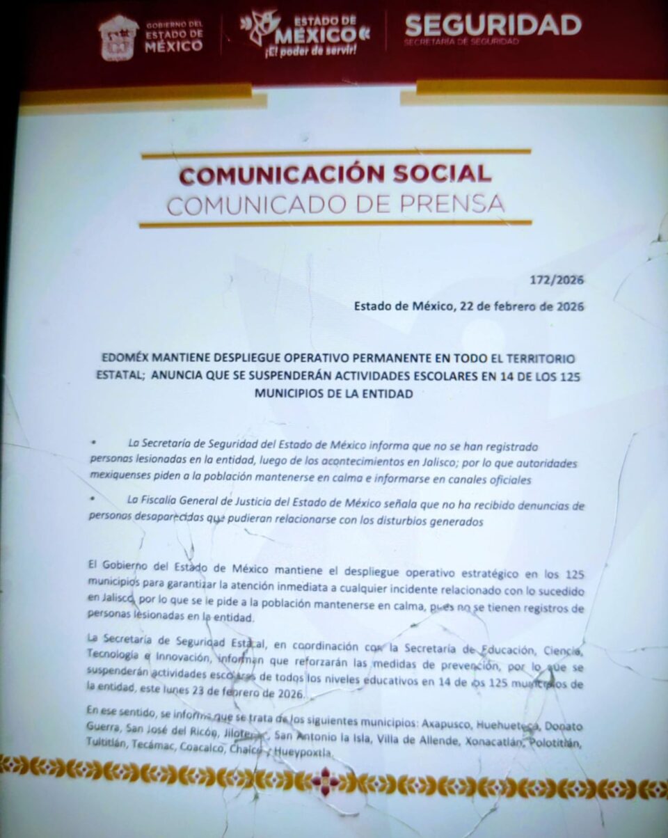 La Secretaría de Seguridad Estatal, en coordinación con la Secretaría de Educación, Ciencia, Tecnología e Innovación, informan que reforzarán las medidas de prevención, por lo que se suspenderán actividades escolares de todos los niveles educativos en 14 de los 125 municipios de la entidad, este lunes 23 de febrero de 2026.