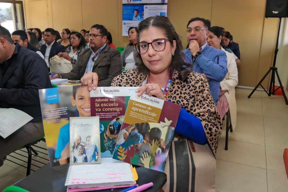 Paola Gómez, oficial de Educación de UNICEF, señaló que el taller forma parte de la estrategia de capacitación conjunta de la SEP y el Gobierno del Estado de México; y recordó que, sin importar su condición migratoria, las niñas y niños tienen derecho a la educación en México.