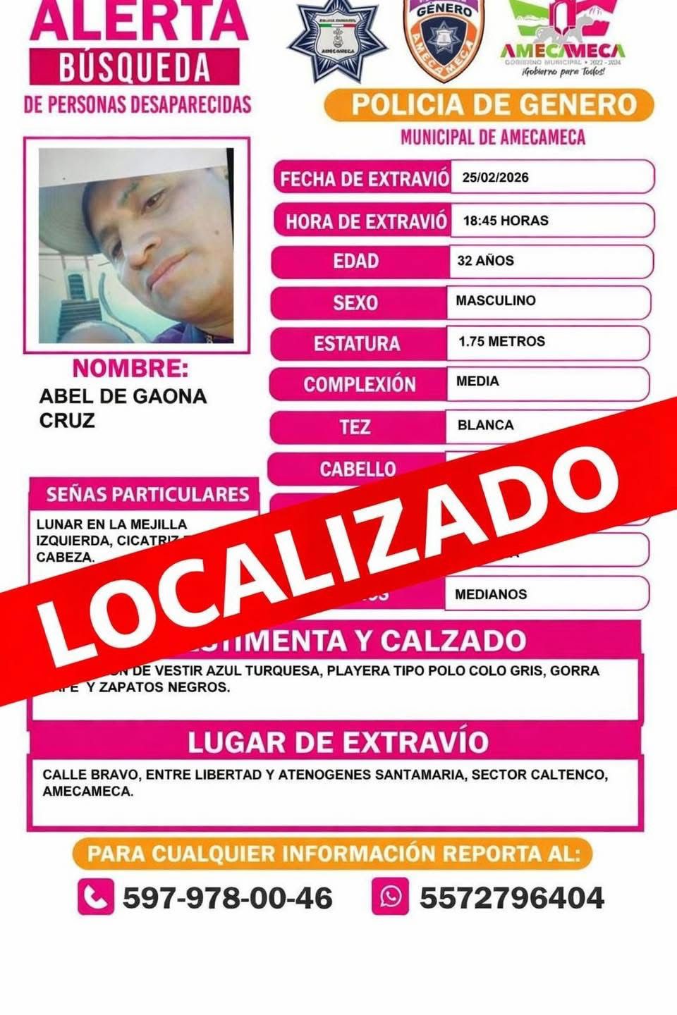 Amecameca, Méx. — La alcaldesa Dra. Ivette Topete informa que, tras la activación de los protocolos de búsqueda, Abel de Gaona Cruz ha sido localizado sano y salvo.