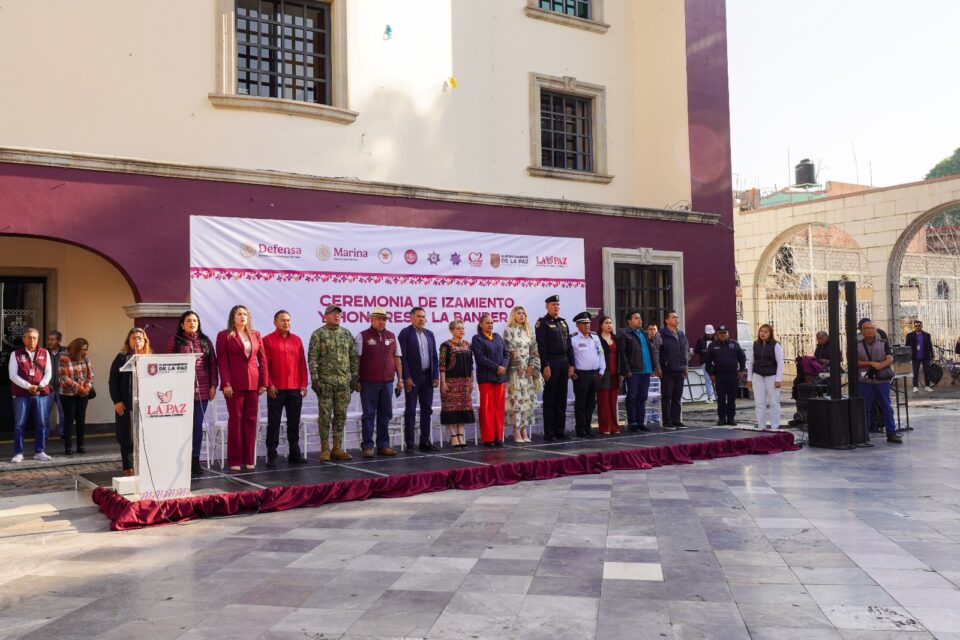 La Paz, Edomex., a 03 de marzo de 2026.— Al encabezar como cada mes la Ceremonia del Izamiento y Honores a la Bandera, la Presidenta Municipal, Martha Guerrero Sánchez, manifestó que somos un pueblo de arraigo y tenemos muchas cosas que presumir; esta bandera es un símbolo de libertad, justicia, lucha de campesinos, obreros, trabajadores y que habla de la historia del concepto de la democracia en el país.