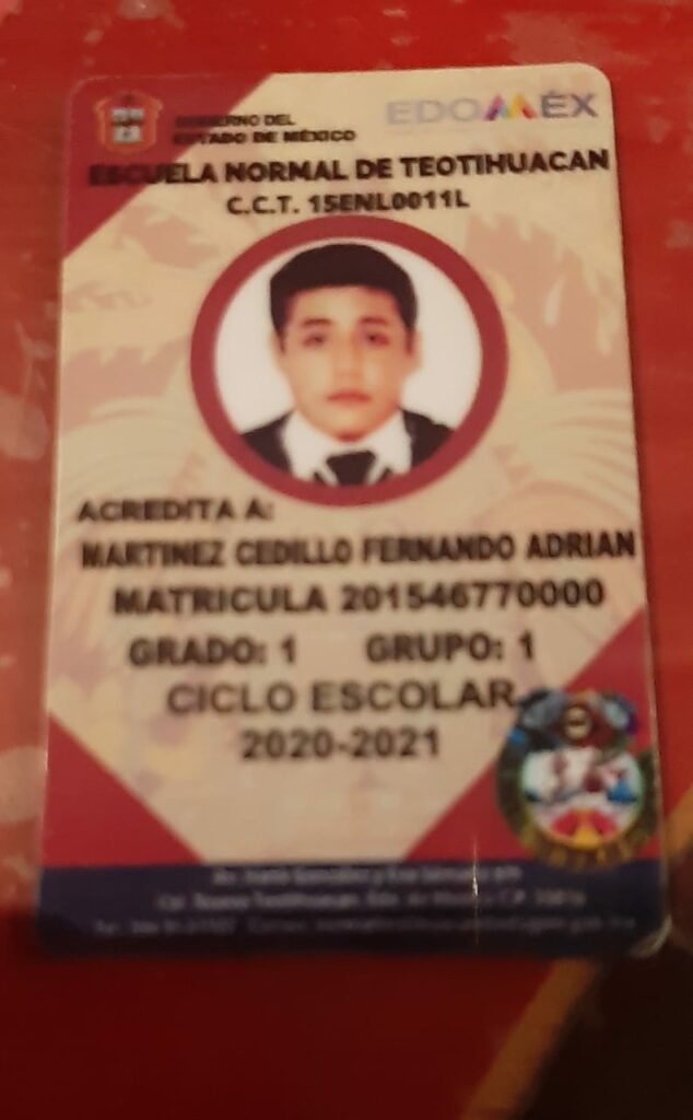 Teotihuacán, Méx.- 14 de septiembre 2021.- Tras haber enfermado de Covid-19 por dos ocasiones que le obligaron ausentarse de las clases en línea, Fernando Adrián Martínez Cedillo, fue dado de baja de la escuela normal de San Juan Teotihuacán, donde cursaba el primer año de la licenciatura en Español para nivel secundaria.