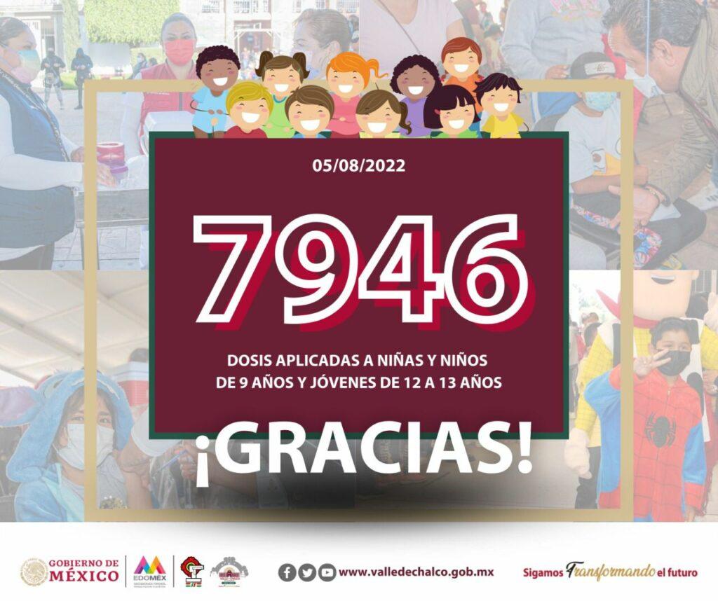 A través del trabajo conjunto entre los tres niveles de gobierno, Valle de Chalco logró vacunar a 7 mil 946 niñas y niños de nueve años y completó el esquema de vacunación a jóvenes de doce y trece años de edad con la dosis de Pfizer-BioNTech.