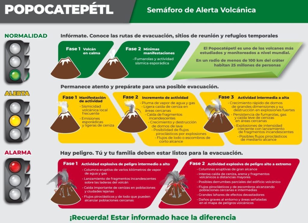 Mientras que Amarillo Fase 2 contempla el incremento de actividad pluma de vapor de agua, ligera caída de ceniza en áreas cercanas, caída de fragmentos incandescentes, crecimiento y destrucción de domos de lava, posibilidad de flujos piroclásticos por explosiones y flujos de lodo o escombros de corto alcance.